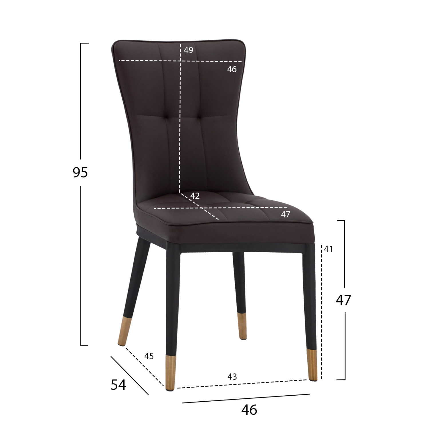 Η καρέκλα SAMMY είναι επενδυμένη με τεχνόδερμα σε καφέ απόχρωση, με μεταλλικό μαύρο σκελετό και χρυσές λεπτομέρειες.