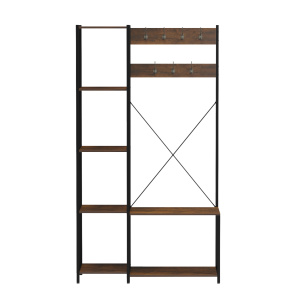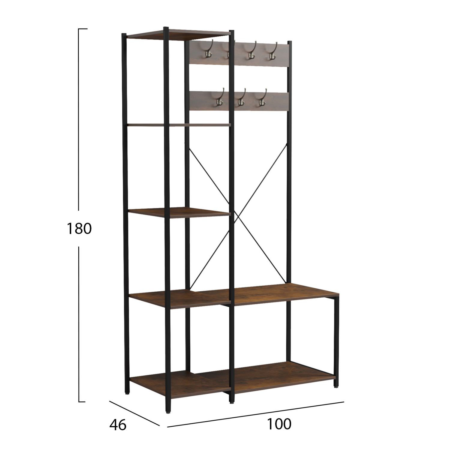 Το επιδαπέδιο έπιπλο εισόδου σε στυλ ανοιχτής ντουλάπας ARANJA είναι ψηλό και συνδυάζει πρακτικότητα και industrial στυλ. Διαθέτει 4 τετράγωνα ραφάκια στην μια πλευρά (+1 την οροφή), ενώ στην άλλη υπάρχει κρεμάστρα με 7 διπλούς γάντζους, και 2 παταράκια στο κάτω μέρος για παπούτσια. Ο σκελετός είναι μεταλλικός σε ΜΑΥΡΟ χρώμα, ενώ τα ραφάκια είναι από μελαμίνη σε χρωματισμό ΚΑΦΕ ρουστίκ.