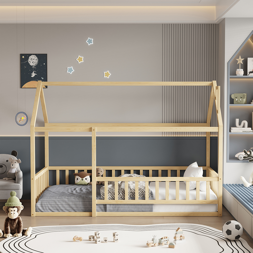 Σας παρουσιάζουμε το καινούργιο παιδικό κρεβάτι HOUSER. Είναι σε διάσταση για μονό στρώμα 90×190 εκ, και αποτελεί μια άριστης ποιότητας, κλασική και ασφαλή επιλογή για το παιδικό δωμάτιο μιας και είναι τύπου Montessori, που σημαίνει ότι έχει σχεδιαστεί σύμφωνα με το εκπαιδευτικό σύστημα Montessori, σύμφωνα με το οποίο τα παιδιά μαθαίνουν καλύτερα, όταν επιλέγουν μόνα τους τι θα κάνουν. Το χαμηλό ύψος κρεβατιού χωρίς πόδια, βοηθά να εξερευνούν την αυτονομία τους και να ανεβοκατεβαίνουν από το κρεβάτι τους ελεύθερα ανά πάσα στιγμή. Είναι ξύλινο σε ΦΥΣΙΚΟ χρώμα βαμμένο με αβλαβές μη τοξικό βερνίκι με βάση το νερό, ιδανικό για παιδιά. Το στρώμα τοποθετείται σε τάβλες κατασκευασμένες από ξυλεία κόντρα πλακέ. Όλο το κρεβάτι έχει σχήμα σπιτιού με καμινάδα που θα δώσει μια ευχάριστη, «ζεστή», και παιχνιδιάρικη όψη σε κάθε παιδικό δωμάτιο, ενώ διαθέτει κάγκελα περιμετρικά.