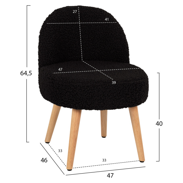 Σκαμπό με πολύ χαμηλή πλάτη YASMINE με επένδυση από ζεστό μπουκλέ ύφασμα σε ΜΑΥΡΟ απόχρωση, με ξύλινα πόδια σε φυσική απόχρωση.