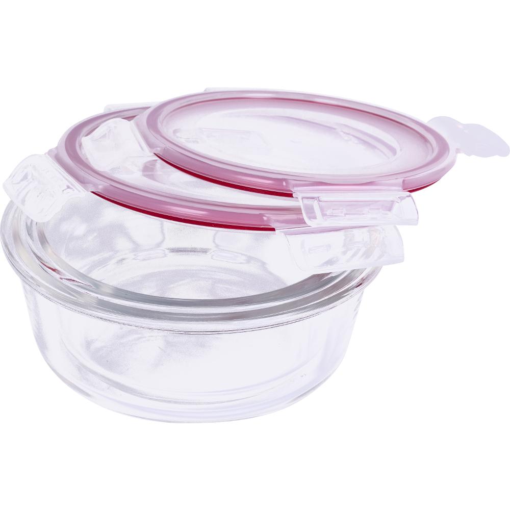 Πρακτικό και αξιόπιστο σετ δοχείων για αποθήκευση και μεταφορά φαγητού, κατασκευασμένο από ανθεκτικό γυαλί και πλαστικό με σφραγίδα καπακιού σιλικόνης υψηλής ποιότητας – αεροστεγές και αδιάβροχο. Διαθέτει βαλβίδα για αερισμό και αφύγρανση του φαγητού. Το φαγητό παραμένει φρέσκο για περισσότερο χρόνο, διατηρώντας το άρωμά του, ενώ δεν διαρρέει κατά τη μεταχείριση. Κατάλληλο για ψυγείο, καταψύκτη, φούρνο μικροκυμάτων και πλυντήριο πιάτων, αντέχει σε θερμοκρασίες από -20°C έως 110°C. Προσοχή: χειριστείτε τα γυάλινα προϊόντα με προσοχή, μην χρησιμοποιείτε το προϊόν αν είναι ραγισμένο. Διαστάσεις Ø 158 mm x 70 mm και Ø 180 mm x 76 mm, όγκος 600 ml και 950 ml, χρώμα διάφανο/κόκκινο.