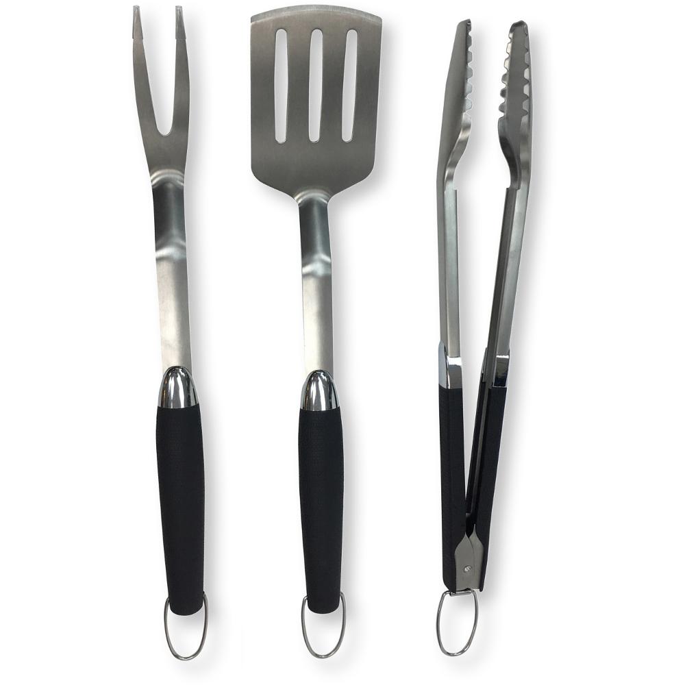 Σετ εργαλείων grill 3 τεμαχίων. Το σετ περιλαμβάνει πιρούνα, σπάτουλα και τσιμπίδα. Είναι κατασκευασμένα απο ανοξείδωτο ατσάλι για μεγάλη αντοχή και έχουν προστατευτικές λαβές απο λάστιχο. Μέγεθος εργαλείων: 43,5 – 46cm.