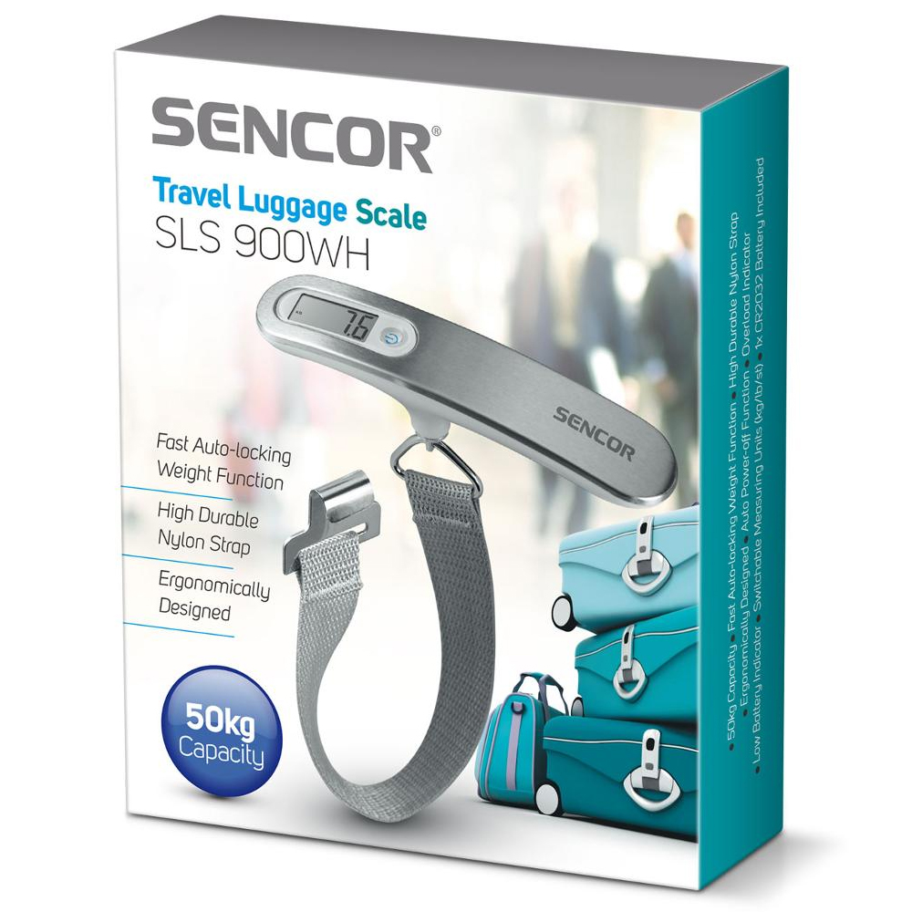 Η SENCOR SLS 900WH είναι ζυγαριά ταξιδιωτικών αποσκευών κατάλληλη για το ζύγισμα αποσκευών, ταχυδρομικών δεμάτων και άλλων αντικειμένων, με δυνατότητα ζύγισης έως 50 kg, λειτουργία Data Lock για ακρίβεια με διατήρηση του αποτελέσματος για 30 δευτερόλεπτα, εξαιρετικά ανθεκτικό ιμάντα από νάιλον με ελάχιστο άνοιγμα για την πόρπη 35 × 11 mm, έξυπνο χειρισμό με ένα κουμπί, εργονομικό σχεδιασμό για εύκολη χρήση με βαριές αποσκευές, χαμηλό βάρος και συμπαγείς διαστάσεις για άνετες μετακινήσεις, ένδειξη χαμηλής μπαταρίας και υπερφόρτωσης, αυτόματη απενεργοποίηση μετά από 30 δευτερόλεπτα αδράνειας, επιλογή μονάδας μέτρησης (kg/lb/st:lb) και τροφοδοσία με μπαταρία λιθίου CR2032 (περιλαμβάνεται), με διαστάσεις 147 × 30 × 46 mm και βάρος 95 g.