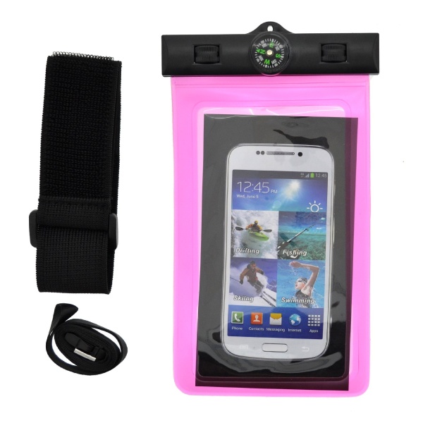 Θήκη Αδιάβροχη Ancus για Κινητά με Κορδόνι μεταφοράς και Πυξίδα Ροζ 16×10.5cm. Η συσκευασία διαθέτει λουράκι και ελαστικό βραχίονα.