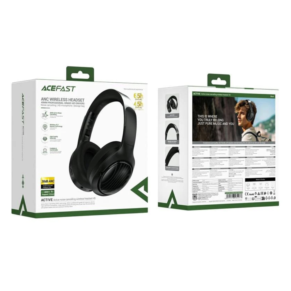 Wireless Ακουστικά Hi-Fi Stereo Acefast H5 30db ANC AUX 500mAh v5.4 Μαύρα με HD Μικρόφωνο Memory Foam Μαξιλαράκια και Θήκη