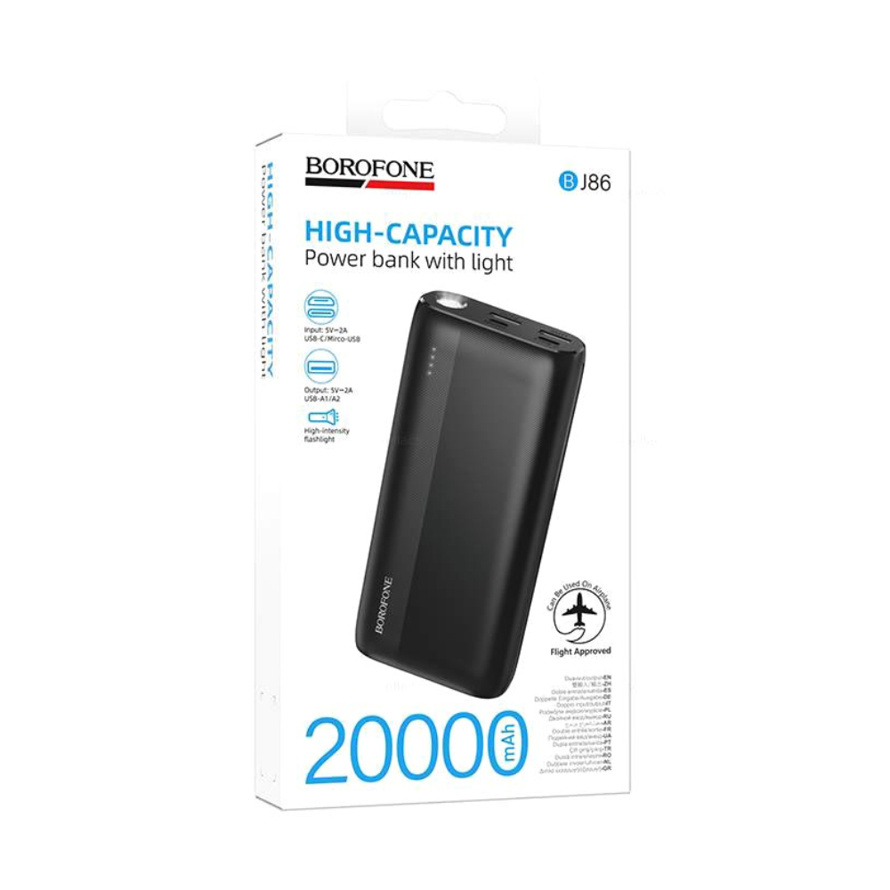 Power Bank Borofone BJ86 20000mAh 5V/2A με 4 Θύρες 1xUSB-C, 2xUSB-A, 1xMicroUSB LED Ένδειξη Μπαταρίας και Φακό Μαύρο