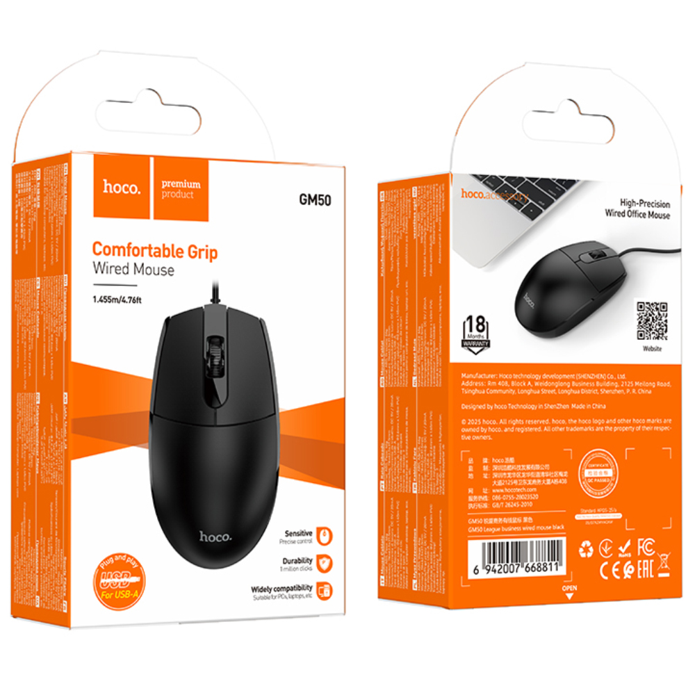 Ενσύρματο Business Ποντίκι Hoco GM50 League με 3 Πλήκτρα DPI 1000 Μαύρο. Διαστάσεις: 116×62.5×37.5mm, Βάρος: 66g