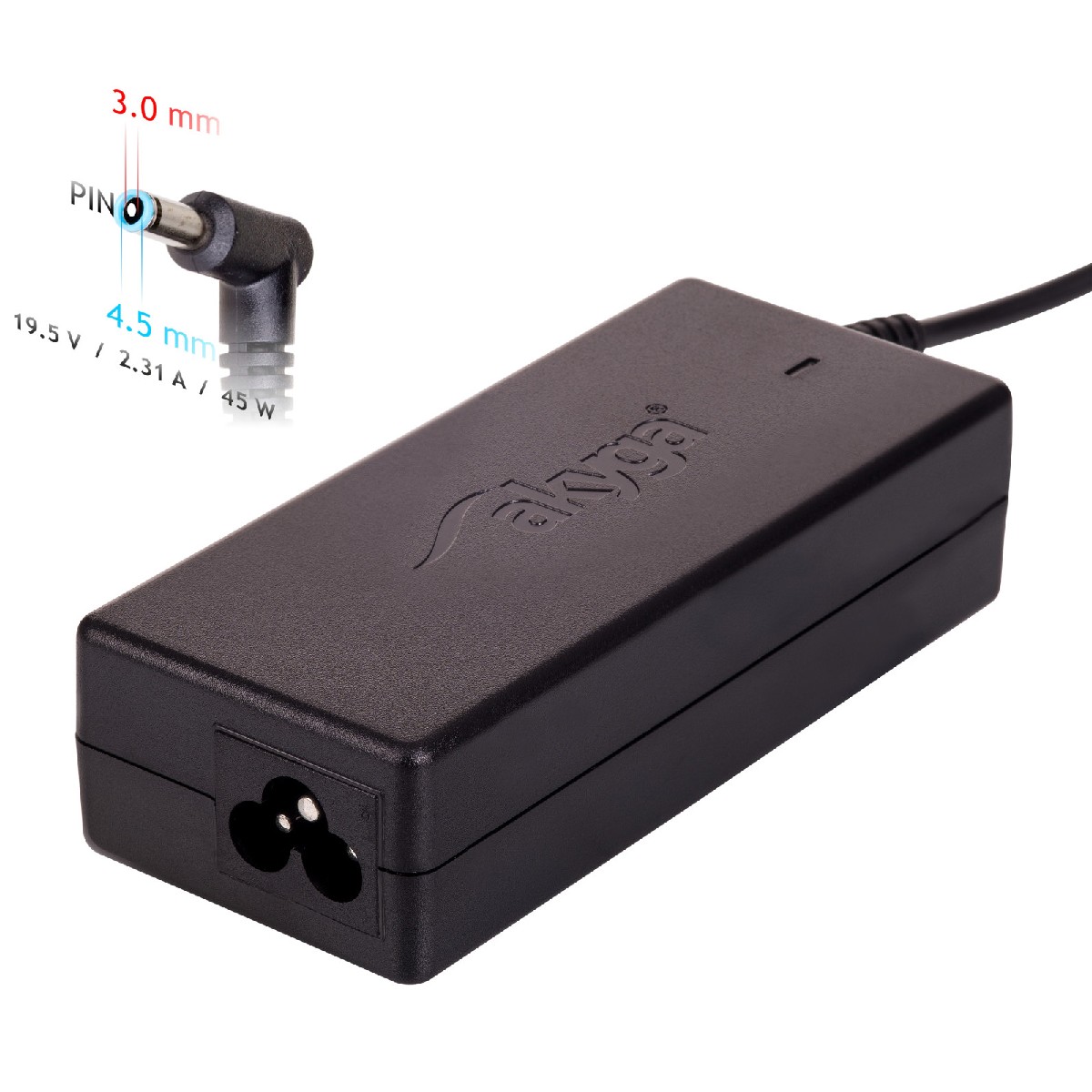 Notebook power supply Akyga AK-ND-69 19.5V / 2.31A 45W 4.5 x 3.0mm + pin HP. Akyga AK-ND-69 is a reliable power supply, dedicated to HP laptops with 4.5 x 3.0mm + pin input connector. The device has high-quality components, which guarantees optimal notebook charging parameters, which are 19.5V and 2.31A. Used protections against the most common threats to power supplies (OVP, OCP, OPP, OTP, SCP, UVP) protect not only the power supply, but also laptop battery. The universal design allows the charger to fit into the style of most laptop models. Cable length: 1.2m