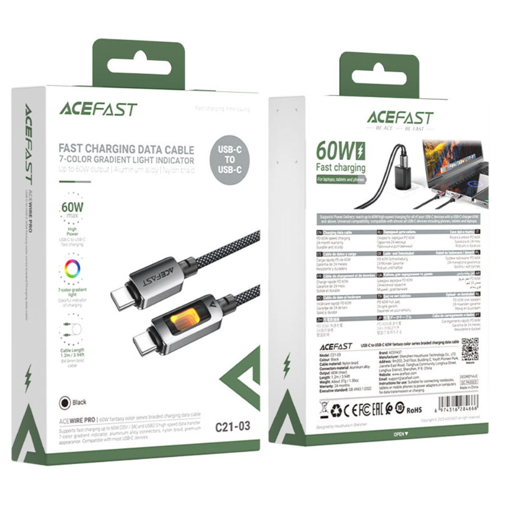Καλώδιο Acefast C21-03 USB-C σε USB-C 60W 3A Fast Charge USB2.0 με LED Φωτισμό Braided Μαύρο 1.2m
