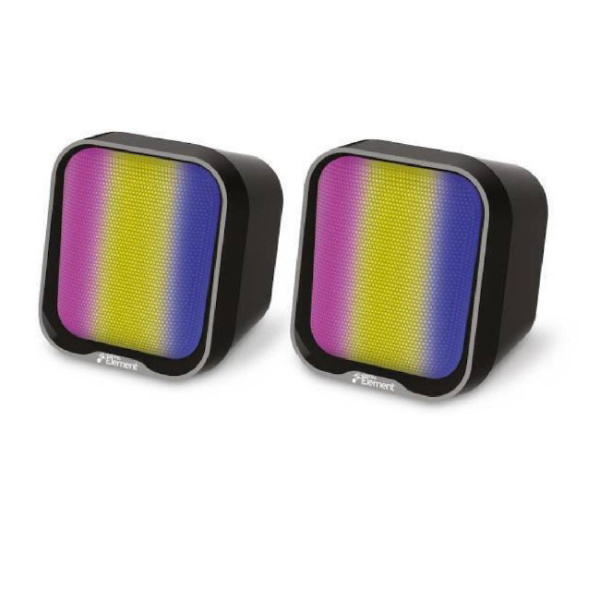 Το σύστημα ηχείων 2.0 της Element έχει ισχύ 2 watt, περιλαμβάνει δυο στερεοφωνικά ηχεία που ταιριάζουν σε όσους θέλουν να τα τοποθετήσουν σε μικρό χώρο ή χρειάζονται ηχεία που μεταφέρονται εύκολα. Συνδέεται ενσύρματα με συσκευές που διαθέτουν υποδοχή για το κλασσικό βύσμα καρφί 3.5mm. Η τροφοδοσία τους πραγματοποιείται μέσω καλωδίου usb. Επιπλέον διαθέτει RGB φωτισμό, ο οποίος δημιουργεί ένα εντυπωσιακό οπτικό αποτέλεσμα, ειδικά όταν βρίσκεστε σε συνθήκες χαμηλού φωτισμού.